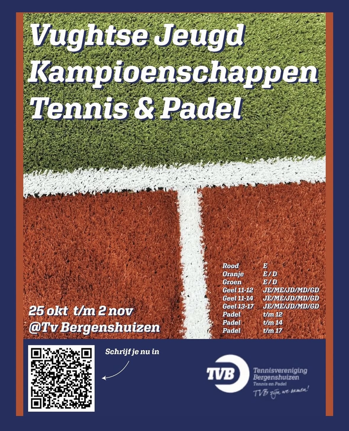 De Vughtse Jeugdkampioenschappen komen er weer aan!! Dit toernooi is voor alle kids die lid zijn bij een tennis- of padelvereniging in de gemeente Vught en wordt gespeeld van 25 okt t/m 3 nov. Het belooft een leuke en sportieve week te worden, dus schrijf je snel in!! De inschrijving sluit op 14 oktober.