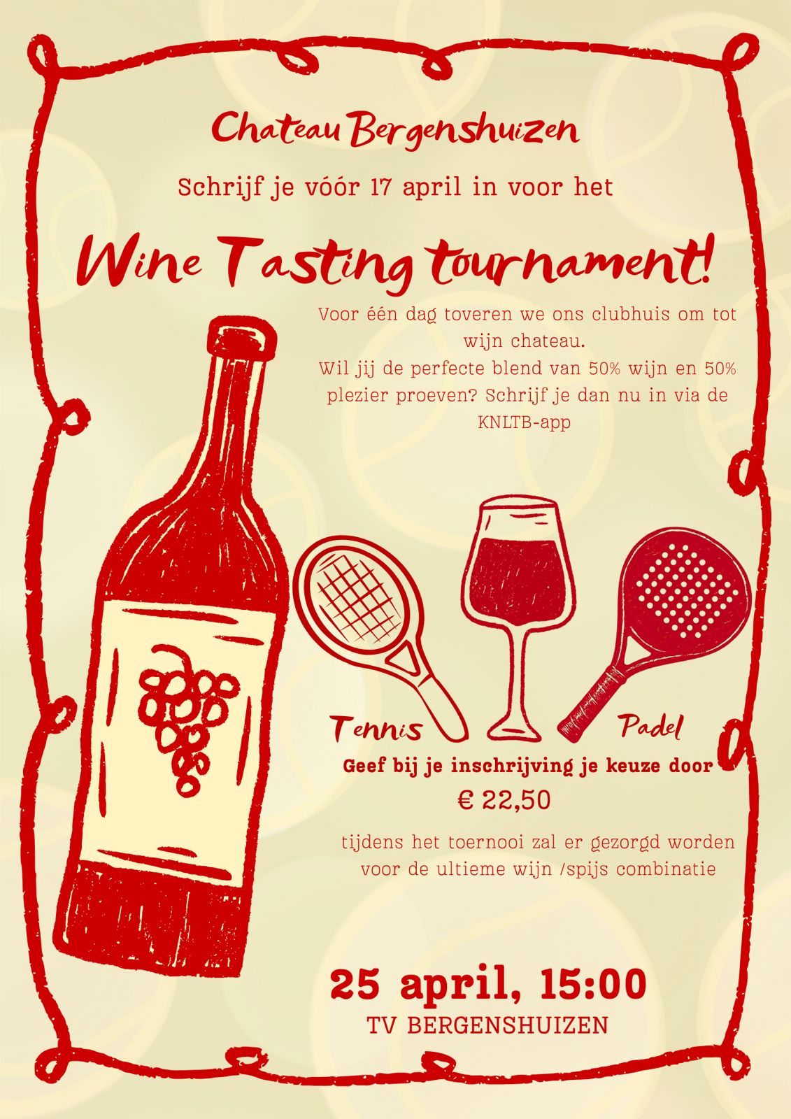 Op 25 april verandert het clubhuis van TVB Bergenshuizen voor één middag in een klein wijnchâteau. Tijdens het Wine Tasting Tournament combineren we sport met wijn en goed gezelschap. Een ontspannen toernooi waarin je speelt, proeft en nieuwe smaken ontdekt.